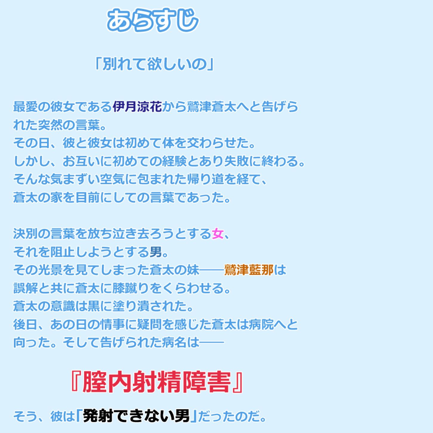 主人公は初体験の失敗から「膣内射精障害」(膣内で射精できない病気)