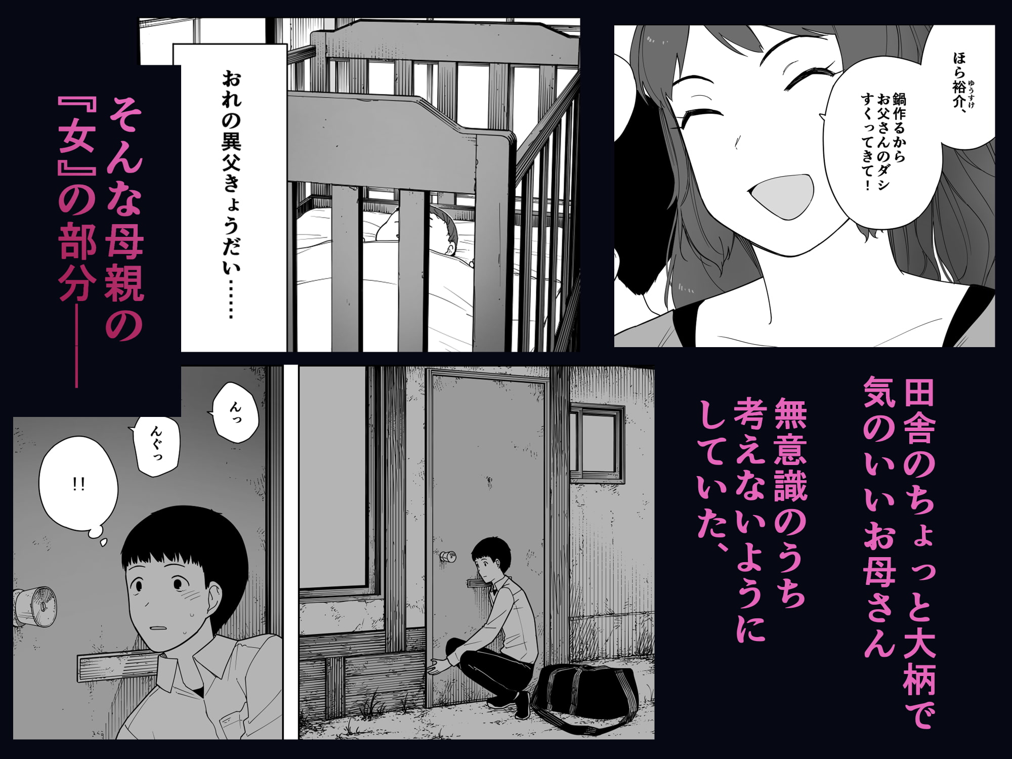 母の上気した顔と少し着崩した服装などの母親からの性的な匂わせ描写と