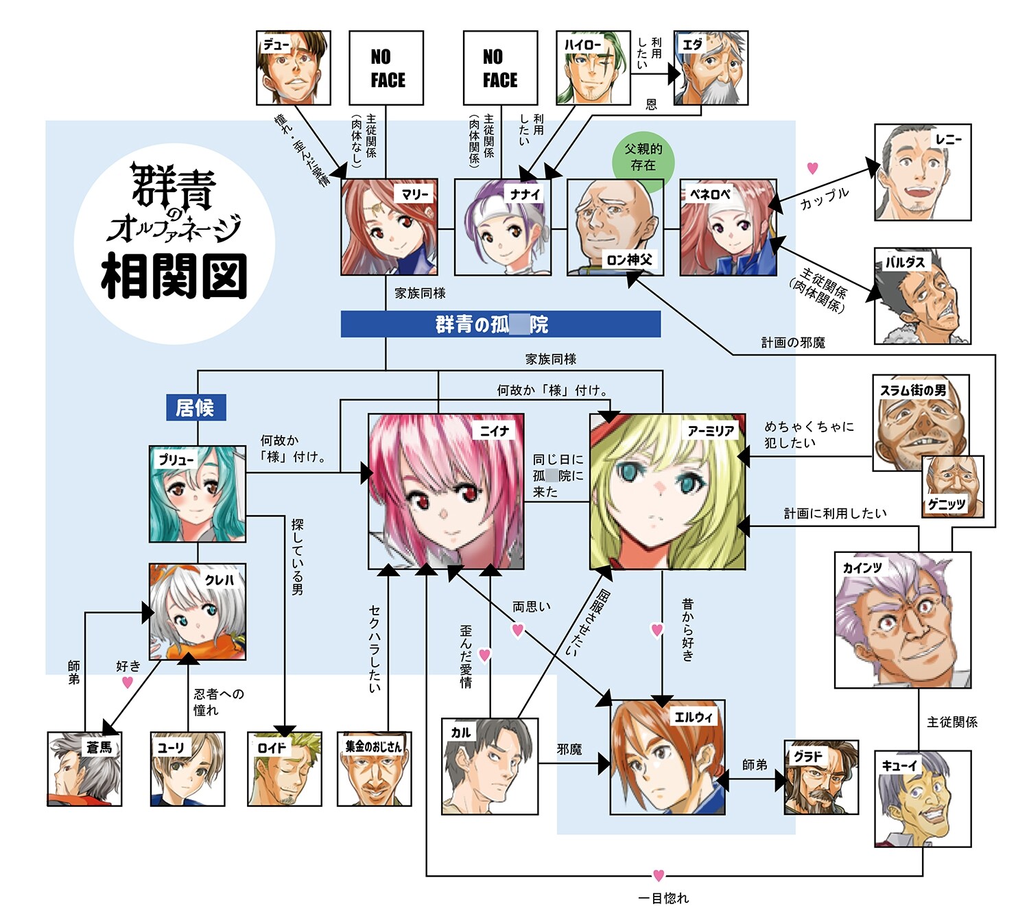 かろうじて生き残った帝国出身の孤○たちは慈悲深いソラハの神父「ロン」に引き取られ、 「群青」と呼ばれる孤○院にて保護されることとなる。