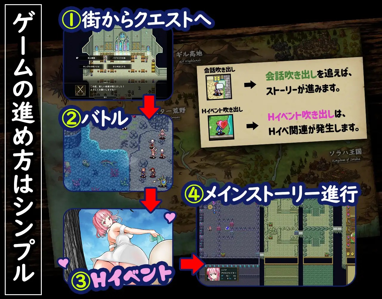 もう少し探索mapで色々出来たらとか、エロステータスとか